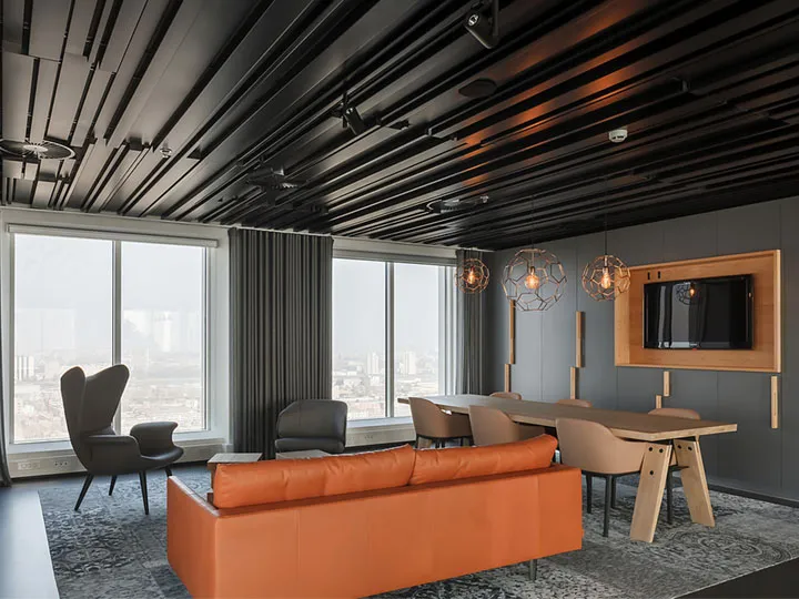 V-shaped baffle ceiling system helps make space more sound absorbent and linearly aesthetic. It gives any space unique effect of refined elegance.